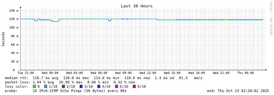 traceroute to 2001:4350:1:1::ff90 (2001:4350:1:1::ff90), 30 hops max, 80 byte packets - Generated at 2025-10-22 03:30:01